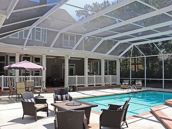 Stunning! Simply no other word to describe this 4 Bedroom, 5 Bath immaculately kept home overlooking the golf course in The Village. From the grand entry with marble floors and circular staircase; to the luxurious bedrooms each with a private bath; to the screen-enclosed pool, hot tub, and back porch; to the gourmet kitchen; the list goes on and on! Formal living, formal dining, game room, playroom or exercise room, office with mahogany-paneled walls. wet bar, kitchenettes in convenient locations- you name it, and this home has it! Upscale finishes throughout. Check out the drone footage under ''Photos''!
