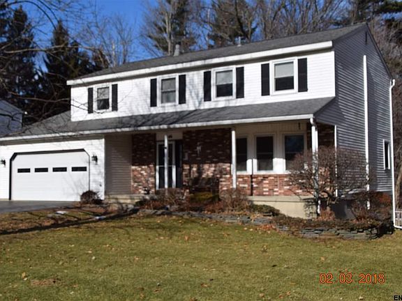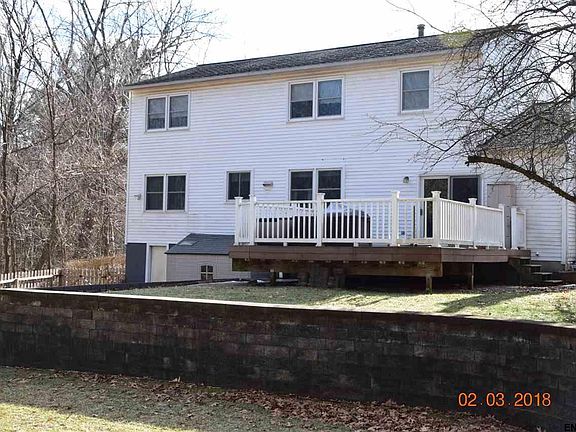 Rare private lot adjacent to forever wild land in convenient location in North Colonie. Very well maintained 4 BR / 1.5 bath custom side hall colonial w/roughed in plumbing & framing for 2nd full bath in walk-out finished basement. Newly renovated open kitchen w/granite counters & stainless appliances. Family room features brick fplc & slider leading to large TREX deck overlooking spacious fenced in yard perfect for kids &/or pets. 2 Car garage w/expanded driveway. Recently updated Central Air & Gas Boiler.