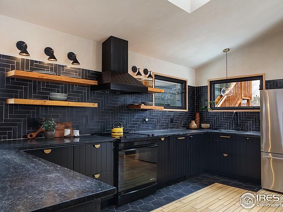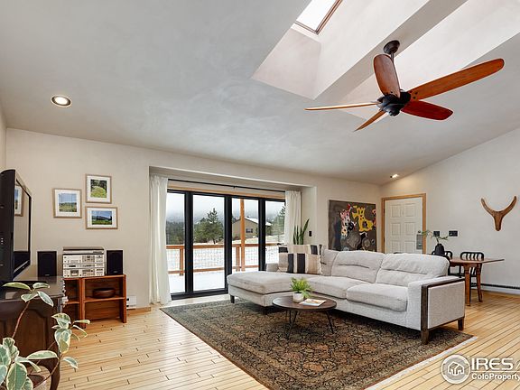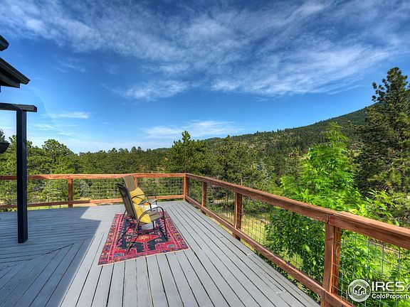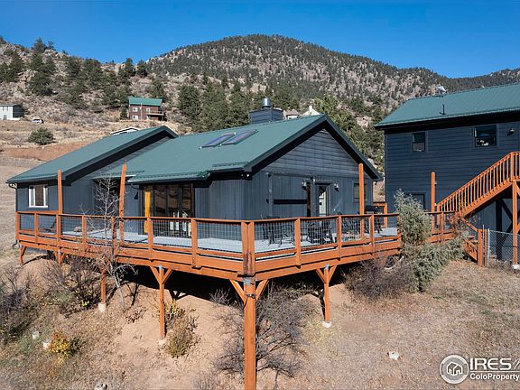 Stunning contemporary mountain retreat in Pinewood Springs! This beautiful 2-bed, 2-bath modern mountain home + a new 580 finished bonus/studio space sits on 1.4 gentle acres, offering the perfect blend of modern comfort and a serene natural setting. Thoughtfully designed with high-end finishes, including American Clay organic plaster walls and ceilings, a remodeled kitchen with soapstone countertops, custom tile and cabinetry, Pella windows, and contemporary exterior paint. One of the standout features is the new 580 sq. ft. studio/bonus space above the detached 2-car garage-not included in the home's 1,402 sq. ft.! This bright, versatile space with stunning views and full bath is perfect for guest sleeping area, home office, or creative studio. Enjoy an open and light-filled vaulted floor plan, anchored by a double-sided fireplace that seamlessly connects the kitchen and living area. The expansive 1,300 sq. ft. wraparound deck offers breathtaking views of the forest in every direction. Your furry friends will love the fenced dog run, and the resilient metal roof adds durability and peace of mind. The home enjoys a water filtration system. Pinewood Springs offers county-maintained roads (including snow removal) and a rural water system, all while being surrounded by Roosevelt National Forest for endless hiking and wildlife viewing. Take a short stroll to the river, scenic trails, or The Cherry Company for coffee and a slice of pie! With no HOA and easy access-just 10 minutes to downtown Lyons and 15 minutes to Estes Park-this is true mountain living at its best! Don't miss this rare opportunity to own a modern, move-in-ready mountain retreat in an unbeatable location!