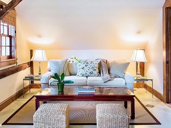 This converted 19th Century Carriage House and Barn complex is accessed via a long gated private driveway and sits nestled on five secluded acres of rolling lawns, woods, a pond and a variety of ornamental, vegetable and cutting gardens. This is a rare opportunity to rent an authentic country home, full of the elegant character and charm and sensitively updated with all modern conveniences. Urban life will feel a world away in this green oasis and yet it is only a three-minute drive to the center of Rhinebeck, which is full of excellent restaurants, bakeries, charming shops and is the epicenter of the activities, history and attractions that have made the Hudson Valley a highly sought after destination. The Carriage House is a rambling three-story home with 4 bedrooms (two king, one double and one single), 3.5 bathrooms, a media room, a reading room, large open double living room and dining room, an enormous eat in country kitchen plus a laundry room, sitting porch and terrace. The converted barn serves as a charming guesthouse with two large bedrooms (one king and one queen) each with a private deck and ensuite bathrooms and a kitchenette for your guests to enjoy their morning coffee in private. The entire property easily sleeps 12 people and well behaved pets are welcome. Please email me for additional photographs and information. Available by the month: October - May $15,000 month June - September $17,000 month