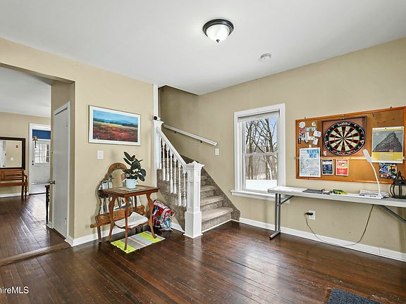 Tucked away at the end of a quiet cul-de-sac, this spacious home offers five bedrooms and two full bathrooms, including a convenient first-floor bathroom. The inviting layout features elegant granite countertops and premium stainless steel appliances, seamlessly connecting to the dining area and a large living room—perfect for gatherings. Outside, you'll find a delightful deck, patio, and a cozy firepit, ideal for outdoor enjoyment. Major upgrades were completed 8 years ago, including a new roof, windows, bathrooms, plumbing, and electrical system. The home retains its charming original hardwood floors and offers efficient comfort with natural gas heating, a newer boiler, and a mini-split system for both heating and cooling. A detached 2-car garage provides additional convenience, while the full attic and basement offer plenty of storage space. Nestled near nature trails and Clapp Park, this updated home combines modern amenities with a peaceful, natural setting.