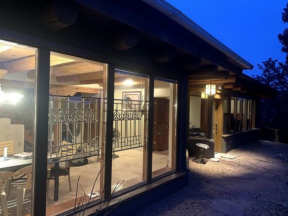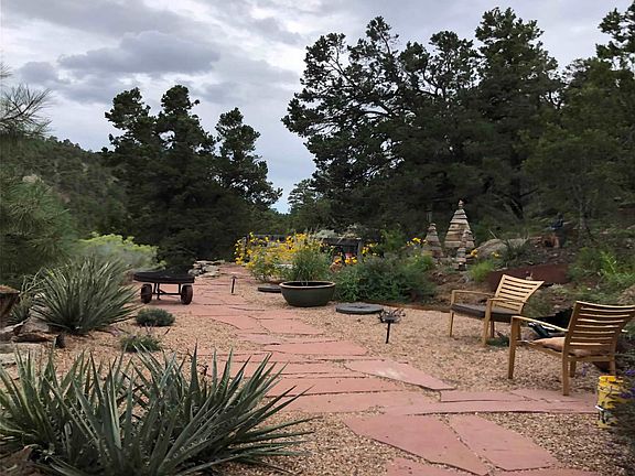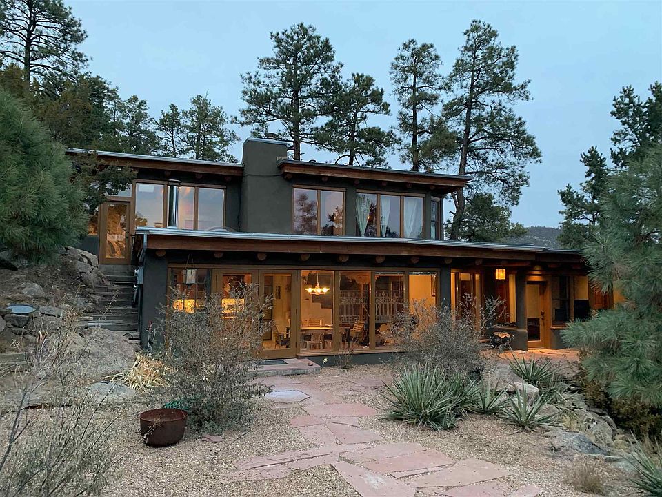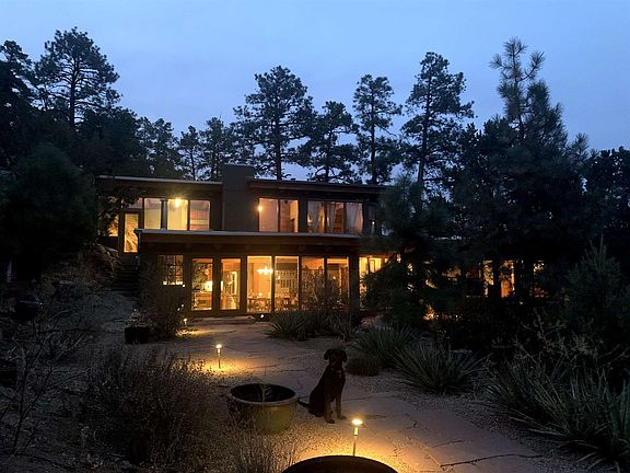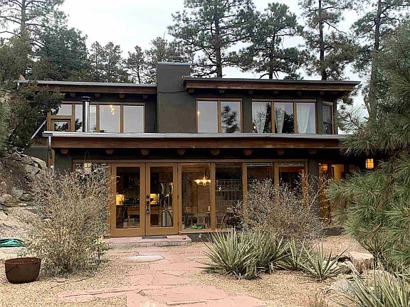 A true mountain oasis minutes from town. This 4 bedroom / 2 bath main house and 1 bedroom / 1 bath guest house sits high above the valley on a Ponderosa Pine filled 2.74 acre lot overlooking national forest. The main house has a large kitchen / living area downstairs with custom concrete counters inlayed with turquoise and stainless steel appliances. In addition to electric baseboard heat, the main floor also has a large wood burning kiva fireplace and a wood burning stove to provide additional heat. There are two bedrooms on the first floor with a shared full bath. Upstairs has a third guest room built around the existing granite along with a full master bath and master bedroom. A huge deck extends from the master bedroom around the north side of the house with views of the surrounding pine covered hills. The guest house, almost completely out of sight from the main house, has a full kitchen and sitting area downstairs with a large bedroom and bath upstairs. Both levels have exterior doors with a small patio off the bedroom. The home has four "off street" parking spaces at the main house and two "off street" spaces across the road from the guest house. There is also an a LARGE storage shed included on the property in front of those two parking spaces.