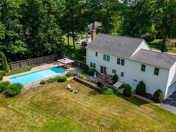 WELCOME TO YOUR OWN PRIVATE OASIS Beautiful Colonial situated on Park like grounds in this seldom listed cul-de-sac of fine homes ~ Central Air, Oversized 2 car garage, 4/5 bed, 2.5 bath. Open Kitchen space with Center Island to seat 4-6, quartz counters, subway tile backsplash, pantry has plenty of storage. Sliders onto the massive stone patio for grilling, relaxing, winning those lawn games and than to cool off steps away to the fenced 18 x 40 in-ground pool surrounded by the stunning border landscaped patio for floating, swimming, sun bathing or just playing. 12 x 12 Pool Shed w/loft & 100 amp service. Hardwood flooring throughout, mixed with carpet, wood fireplace in living room, front room for a private office or relaxing space. Separate Dining Room to host many gatherings. Laundry & 1/2 bath as you walk in from garage. Upstairs to Master suite including huge walk in closet, 3-4 more bedrooms, the optional finished 20 x 20 room above garage. A full bath with plenty of closet space, including the walk up attic through master. Open tall ceilings in basement ready for finishing up.....Full house 'owned' water filter system, by H2O...And....if you lose power? Generator & hook-up with alarm.