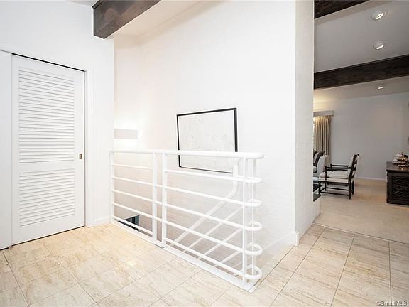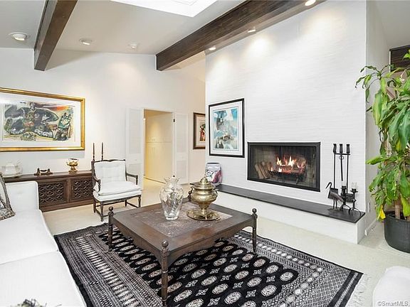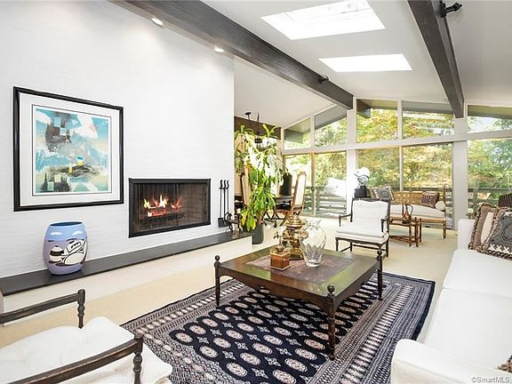 California contemporary style 3 bdrm, 2.5 bath ranch nestled on private lot emanates style and light with walls of glass, skylights, vaulted wood beamed ceilings, and wows with architectural appeal. A marble tiled foyer leads to the open concept living and dining room with oversized fireplace and sliders to expansive wrap around deck. The white kitchen with black granite counters, center island, stone tile floor, and upscale appliances warrants home cooking. Adjacent to kitchen is the den with built in cabinetry, sliders to deck, vaulted ceiling and skylights. Master bdrm suite features a marble bath and ample closet space. Two generously sized bedrooms complete the main level. The lower level family room adds over 500 sq. ft. of additional living space with beautiful stone fire place, sliders to stone patio and yard, a half bath, laundry plus storage and workshop room. Truly a home to watch the seasons change and connect with nature while working or relaxing indoors. Centrally located, near highways, shopping, New Haven, and close to Amity's award winning schools.