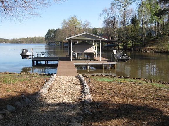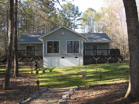 This one level home has an open floor plan with free standing gas stove, & lots of glass on Lakeside. There's 3 bedrooms & 2 baths w/ master on the waterside. Home features spacious Lakeside room for your morning coffee or just relaxing and enjoying the Lake life with family & friends. Home has been well maintained & is in ready to move in condition! Home has new roof, vinyl siding w/ windows & doors wrapped in metal, new ceramic title in Master bath, kitchen,hall & utility rm. Heat pump only 2 years old. Flat lot makes access to the riprapped waterfront w/ single boathouse a breeze. Boathouse has 1 boat lift & 2 jet ski lifts. Just across the street Tanglewood Shores offers a 9 hole golf course, swimming pool & tennis court. Just down the road is the public boat ramp, Popular Creek Marina, Rosemont Winery and just minutes from I-85. A MUST SEE property to appreciate it's Value.