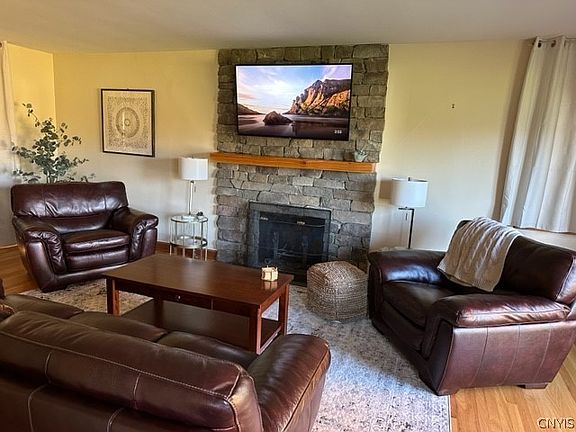 Nicely upgraded c.1949 offers open concept floor plan sitting on the 13th hole of Colgate University's' Seven Oaks Golf Course - A quick walk to schools, shops, restaurants and all things Hamilton! A 2-car attached garage opens to the kitchen/utility area featuring a 1/2 bath & laundry room just off a spacious kitchen w/breakfast bar, stainless & granite that opens to a spacious dining room featuring large back yard and golfing views. A good flowing floor plans offers large living room w/stone fireplace, built in bookshelves, big windows & access to large rear deck overlooking back yard & golf course. Spacious upstairs offer three bedrooms and two baths featuring En' suite master BR. This property has recently seen refreshed updates and is in move-in condition. A wonderful property!