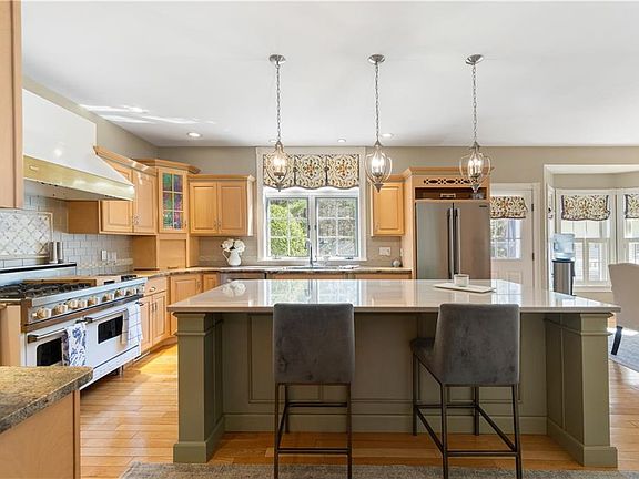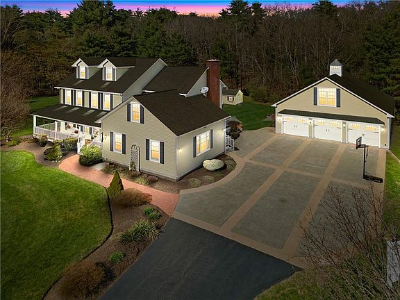 As you approach this unique property you will notice its elegance immediately. This 4 bedroom 2 1/2 bath home is situated perfectly on just under 3 acres. The grounds are a balance of manicured and mature landscaping surrounded by a wooded lot with a water view. The property offers a detached, heated, 5 car garage with an additional 1000 square foot loft area. The main house offers 4500 square feet of living space. Upon entering this beautiful home, you are welcomed into the stunning foyer. This leads into the chef's kitchen with marble counters, center island and Viking stove. The kitchen seamlessly flows into the large breakfast nook filled with natural light. There is also a sitting area with wood burning fireplace. To finish the first floor there is a family room with wet bar, second refrigerator and formal dining room and a half bath. All complete with detailed molding, beautiful wall papers and hardwood floors. The second floor, has a main suite with an oversized bedroom and walk-in closets. There are 3 additional bedrooms and laundry area on the second floor. The third floor is a finished bonus room and the basement is finished. Lastly, the home has a beautiful wrap around porch which will provide you with an amazing outside entertaining area. RECENT UPDATES: Paint, carpet and Heating System. Property conveniently located off Rt 146, I-295 and easy commute to Providence or Boston. PLEASE CALL FOR PRIVATE SHOWING.