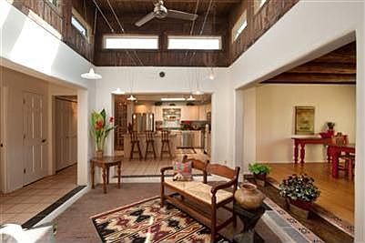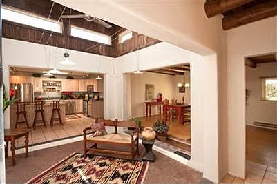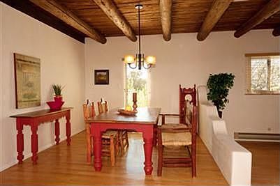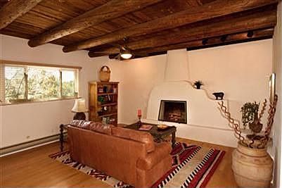 Move-in-ready! Beautiful home in secluded forest setting in the foothills of the Sangre de Cristo mountains, yet convenient Santa Fe location. The home has all the characteristics of a forest/mountain home complemented with traditional vigas, an open fireplace, as well as all modern conveniences. Outside living area includes a patio dining area. This charming home includes a spacious living room with an open fire place, dining room, kitchen, two bedrooms, and a office/study(possible 3rd bedroom). Fenced yard, new low E windows (Accent). 2 bedroom 2 bath floor plan with an office. Office could be converted to third bedroom. Recently remodeled, updated kitchen & baths. Rural property location with easy access to city lifestyle.
