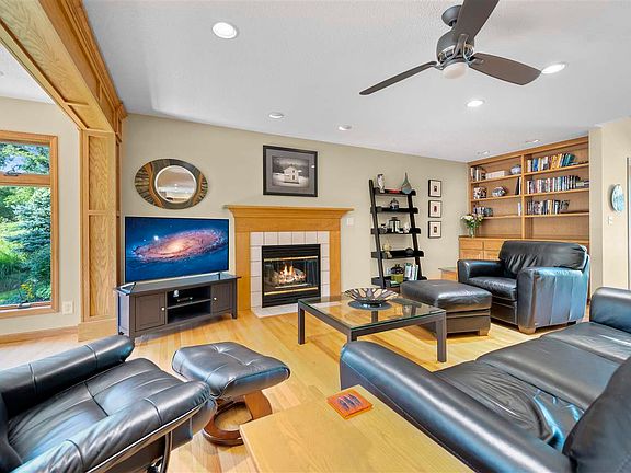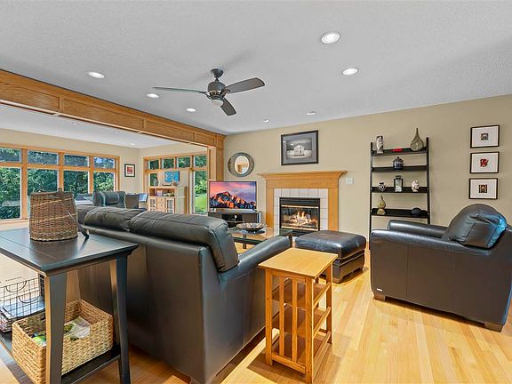 Remarkable find - a not too big home on an acre lot, filled with wonderful amenities, top notch updates, and outstanding views in every season. When you enter through the front door, you will be great with a view straight towards the back overlooking a wonderful yard and wooded ravine. Great care and thought has been given to the various updates, including the addition of the 14' x 11' sunroom, which is a flexible use space. The room has windows on three sides, which makes for great views whether from a large dining table, easy reading chairs, a home office, or a feature room for your grand piano. The large open floor plan is light-filled and inviting. The second floor features three bedrooms, and the en suite primary bedroom has a remodeled bath with a heated tiled floor, double vanity, and a large walk in tiled shower. In the walk-out lower level, a home office is in a set-aside area complete with built in book cases and desk space. The rec area of the lower level is large (21' x 14'), with a second gas fireplace and wired TV speakers.