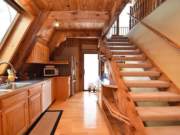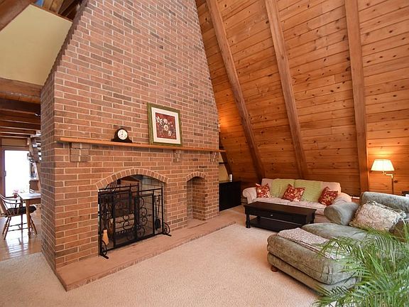 Feel like you are on vacation all year when you own this adorable and unique A Frame home, situated on over 4 acres with picturesque views! The first floor features include an eat-in kitchen with oak cabinets and lots of storage, a bright and open living room with exposed beams and a stunning double sided fireplace, a wall of sliding doors leading to the wrap around deck, one bedroom, and a full bath with a soaking tub. The 2nd floor loft style master suite has large closets, a cozy sitting area and a 3/4 bath. The basement would be easy to finish and includes two bonus rooms and another 3/4 bath with laundry hook ups. This home is ready for you to relax and enjoy!