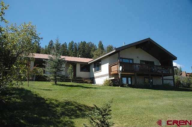 THE BEST VIEWS in all of Pagosa Springs. This home encompasses the entire corner and the house sits towards the back of the lot which makes this ideal for horses or just an amazing parcel where no one can take your view away and the deer & the families of turkey can nestle under the fruit trees and oaks. Completely upgraded, this open kitchen is now made for the gourmet cook. New deck expands and lets the outdoors become a main part of your living space. Enjoy the outdoor Jacuzzi with a glass of wine under the stars. Two large master suites each with their own bathroom and two more bedrooms downstairs. Beautiful fireplace with windows galore. Ideal for entertaining. Close to town with the feel that you are tucked away. Attached garage plus another separate workshop / garage at entrance of drive. This is such an amazing home, once you step in, you will be proud to call this home so make sure this one is on your list of homes to see.