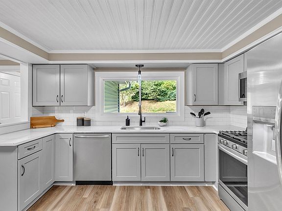 Nestled in the countryside and surrounded by greenery, this beautifully renovated ranch-style home blends contemporary updates with modern style. The bright living room, bathed in sunlight, features a cozy brick fireplace and a comfortable sitting area. The stunning new kitchen boasts quartz countertops, stainless steel appliances, and a stylish backsplash. The dining room off the kitchen offers a versatile space for meals and gatherings. Three well-sized bedrooms provide ample closet space, while the updated bathroom adds a fresh, modern look. The lower level includes two finished rooms, perfect for a gym or entertainment area. Enjoy outdoor gatherings in the expansive backyard, offering a serene retreat. Additional features include a two-car garage for convenient parking and storage. This home offers a perfect blend of style, comfort, and tranquility.