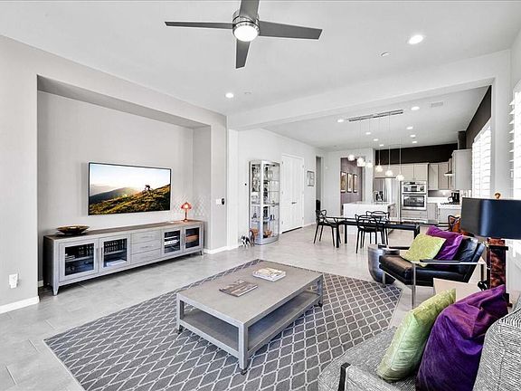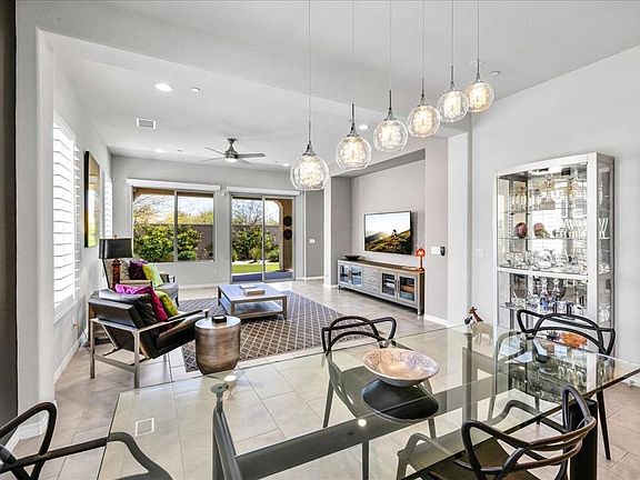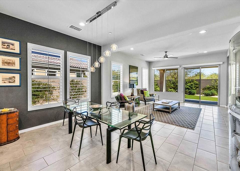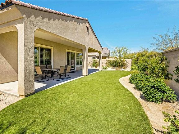Embrace the Desert's upscale 55+ active adult community--Del Webb at Rancho Mirage. Your own 'SOLITUDE' model home awaits. Premium location on oversized lot featuring extended rear patio cover with lush desert curb appeal. OWNED solar. Refreshed contemporary style home with modern clean lines & bright interior. High ceilings and oversize windows frame picturesque desert views. Private enclosed backyard overlooks expansive open space. Low maintenance landscape feels lush with synthetic turf and mature trees. Gourmet kitchen features 6-burner cooktop, wall oven microwave combo. Tasteful gray cabinetry, gorgeous oversize quartz waterfall island, quartz counters and backsplash, large pantry. Stunning pendant chandelier lights adjacent dining. Spacious primary suite with slider to back patio, spa-like bath and walk-in closet. Layout inviting for guests--2nd bedroom and bath PLUS den. Modern ceiling fans, easy-care plank-style tile flooring, carpet in bedrooms. Custom window shades & shutters. Eye-catching accent walls, designer wallpaper & tile. Newer Toto toilets. So many upgrades to fixtures & finishes! Laundry boasts added storage cabinetry. Gated community offers world-class amenities to enjoy: 24-hr guard gate entrance, miles of meandering pathways, Outlook Community Center, resort-style pool & spa, tennis, pickleball, bocce, fitness center and more. Enjoy gorgeous interior, lounge outdoors, stargaze--this property is the IDEAL place to call HOME! Stop searching and START living!