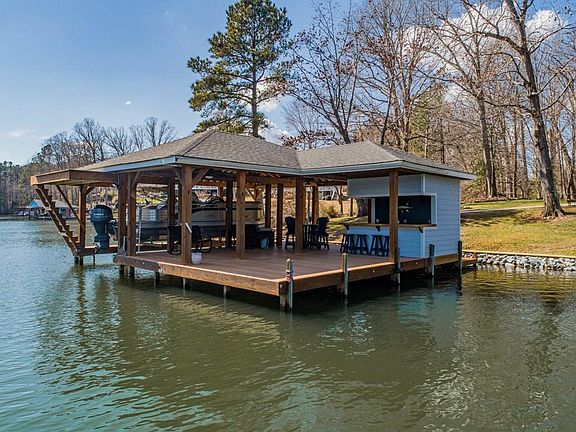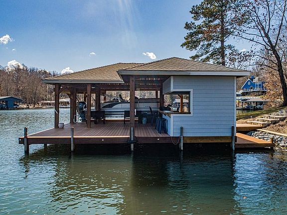 This property will not disappoint-15' water depth, over 300' of cleared shoreline, well constructed, maintained, designed & decorated home boasting 3 bd, & 2 undesignated rooms, large double boathouse with boat and jetski lifts, 2 car attached garage, 2nd garage at lower level, paved circular drive, brick low maintenance exterior, impressive reclaimed wood floors, great room w/ wood burning fireplace, large main level master suite, spacious upper level bedroom with waterside balcony- a lower level perfect for entertaining w/ a bunk room, full bath, and spacious entertaining room with pool table. The exterior spaces are amazing- the large deck with composite decking and covered patio all have stunning waterviews! This beautiful property is located on a deep water large main lake cove. Most interior furnishings can be negotiable at the right price. Hurry this will not last!
