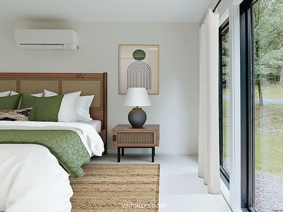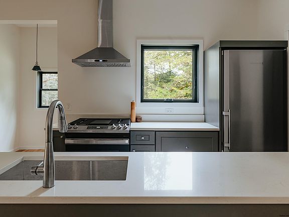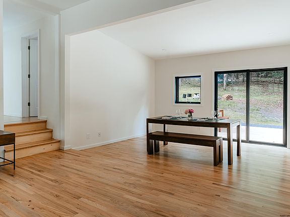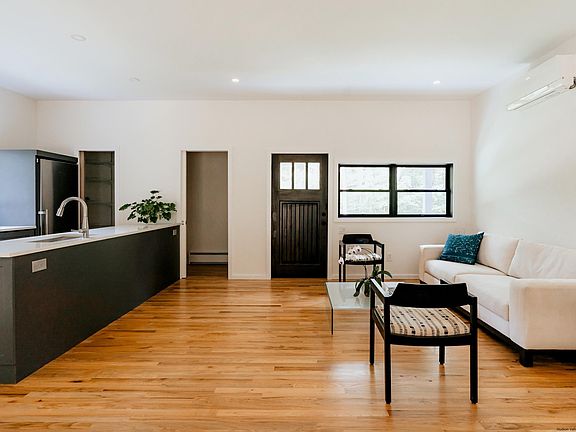Having undergone a complete gut renovation, this well-designed home (with a new layout by renowned architecture firm Studio MM) is surrounded by 2.5 acres of wooded forest off a quiet country road – and is essentially brand new. Enter into the home’s living area where the flow between the living room, dining room, and open galley kitchen is perfect for daily living or entertaining guests. The kitchen boasts quartz countertops, a spacious pantry, and a charming breakfast nook where you can savor your morning coffee. The living space features sliding glass doors that lead to a spacious deck, inviting you to step outside and immerse yourself in the serene surroundings. It’s easy to picture yourself hosting barbecues, enjoying al fresco dining, lounging on the deck, or taking in the sights and sounds of the wooded backyard while sitting around the fire pit. Two cozy, carpeted bedrooms (one with oversized windows that captures views of the forest) provide a peaceful retreat for restful nights. The full bathroom is elegant with contemporary finishes and a glass-enclosed shower, and a convenient half bathroom in the main living space caters to the needs of residents and guests alike. A back entry off of the deck opens into a mudroom and a separate laundry room, ensuring that outdoor elements are kept at bay while maintaining an organized and efficient living space. To complete this remarkable property, a large two-car garage (687 sq ft) has undergone its own renovation with restored board and batten siding, a new roof, and upgraded garage doors and seamlessly blends with the home's aesthetic. This has potential to be easily finished, or used as-is, as a seasonal office, studio, gym, or other bonus space. The commitment to quality is evident throughout with SmartSide siding on the exterior (durable engineered wood siding that requires minimal maintenance) and beautiful oak flooring inside. From roof to basement, every inch of this home has been thoughtfully considered and upgraded to improve efficiency and functionality for the next lucky owner to enjoy. Perfectly situated on a quiet country road in Kerhonkson, this home is minutes from outdoor destinations like Vernooy Kill Falls and the Ashokan Reservoir, and just 15 minutes to Minnewaska State Park and Mohonk Preserve. It’s near all of the popular markets and farm-to-table spots in Kerhonkson and Accord, 17 minutes to shops and restaurants in Ellenville and Stone Ridge, 30-35 minutes to Kingston, Woodstock, and New Paltz, and less than 2 hours to the GWB in NYC.