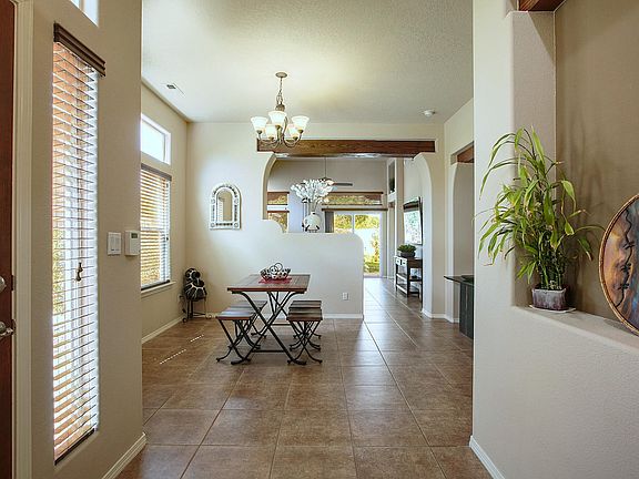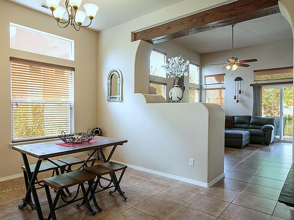Ok, you finally found the perfect one-story home! Well-cared for, refrigerated air, a large kitchen w/ stainless steel appliances, pantry, solid surface counters and high ceilings thru-out. 3 Br - 2 Ba - 2 Car; open living, dining, exposed beams, Fireplace and NO Carpet. The backyard is ready for your Bar-B-Que. Located in the highly desired Willow Trace Subd. tucked away in a cul-de-sac. Just minutes from open spaces w/ a walking paths, sports complex, parks & eats. The Owner's Suite is spacious & offers 2 sinks, a separate tub & shower & a huge walk in closet. Rio Rancho high school & elementary, the library, & Aquatic center are all close by. Don't pass up this wonderful neighborhood. You have finally found your home! ***Excluded from sale are the lights and fan on the pergola.