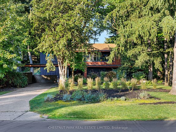 Architectural jewel in The Kingsway! Mid-century framework, Bauhaus clarity, and a setting that steals the show. Set on a ravine-kissed, cul-de-sac corner lot - 60 feet at the street widening to nearly 134 at the back - the property feels like a boutique spa submersed in nature: terraced gardens, multiple outdoor living zones, a sauna, and a cold plunge. You forget the city, even as Humbertowns renewed shops and Royal York & Bloor sit minutes away. Inside, light pours through floor-to-ceiling windows, framing gardens and wooded vistas. A floating staircase anchors the foyer; cedar-lined ceilings and oak floors bring warmth and texture. Sightlines, symmetry, and quiet discipline guide the plan - function meeting form without fuss. The main-level retreat opens directly to the landscape, complete with dual custom walk-ins and a spa-calibre ensuite. Above, a modernist kitchen with marble counters and custom cabinetry flows into dining and living, punctuated by a granite fireplace and dramatic glass wall pivots to the outdoors. Every space feels intentional; every detail, considered. Not just a house, but an authentic expression of mid-century living - embracing light, celebrating landscape, and inviting creativity. For the design-minded who believe home should inspire, 57 Wimbleton is a residence of rare poise, shaped by light and nature.