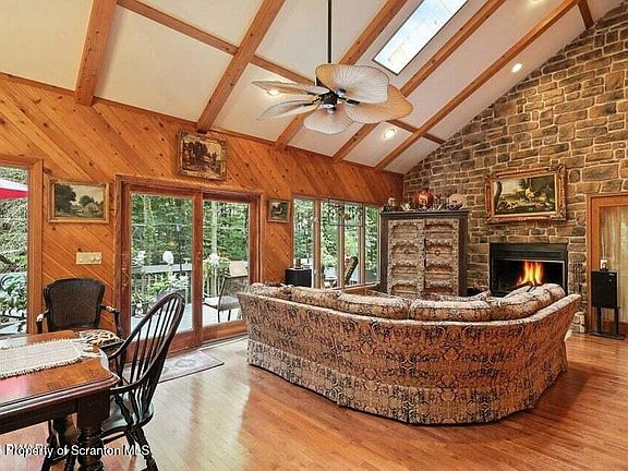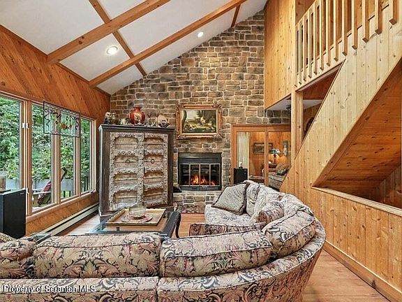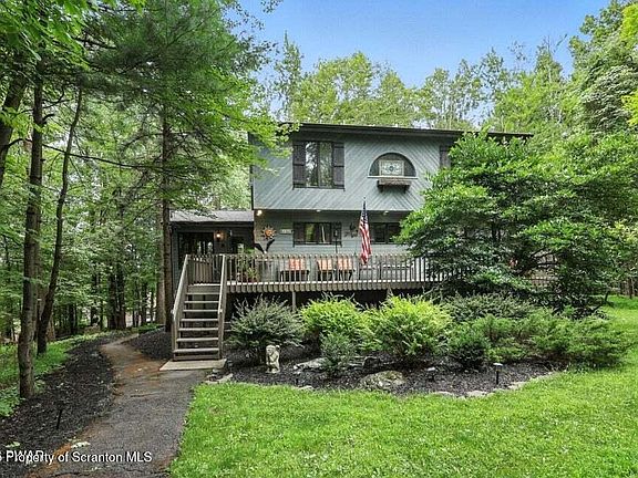 Welcome to this stunning Saltbox-style home nestled in the desirable community of The Hideout, offering a perfect blend of charm, functionality, and scenic beauty. This beautifully maintained residence features four spacious bedrooms and three bathrooms, providing ample space for family and guests. The versatile layout includes two flexible rooms that can easily be transformed into additional bedrooms, a home office, or guest accommodations, catering to your unique lifestyle needs. The finished basement boasts a panel-finished recreation room with a full bath, and it features a convenient walk-out, providing easy access to the backyard and enhancing the home's outdoor living potential. The main living areas showcase impressive beam and vaulted ceilings, adding architectural interest and a sense of spaciousness. Most rooms feature tongue-and-groove paneling, adding warmth and character, while all rooms are equipped with oversized windows that flood the space with natural light. Many rooms also have hardwood floors, enhancing the home's timeless appeal. The residence features two inviting fireplaces--one in the living room and another in the family room--serving as cozy focal points. Two bathrooms are fully tiled on the walls, offering durability and a sleek aesthetic. The primary bedroom features oversized mirrors on the closet doors, adding a touch of elegance and enhancing the sense of space. Enjoy the breathtaking Northeast Pennsylvania scenery from the expansive front and back decks, perfect for entertaining, outdoor dining, or relaxing while taking in the natural surroundings. The four-season room is adorned with exquisite cedar tongue-and-groove paneling, providing a charming space to enjoy the outdoors throughout the year. The beautifully landscaped yard further enhances the home's curb appeal, creating a peaceful retreat just moments from community amenities. This exceptional property combines timeless architecture with modern comforts and picturesque scenery.