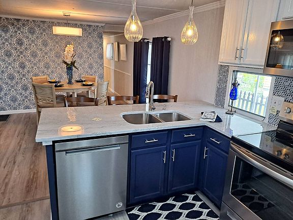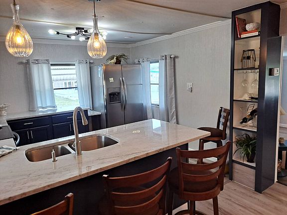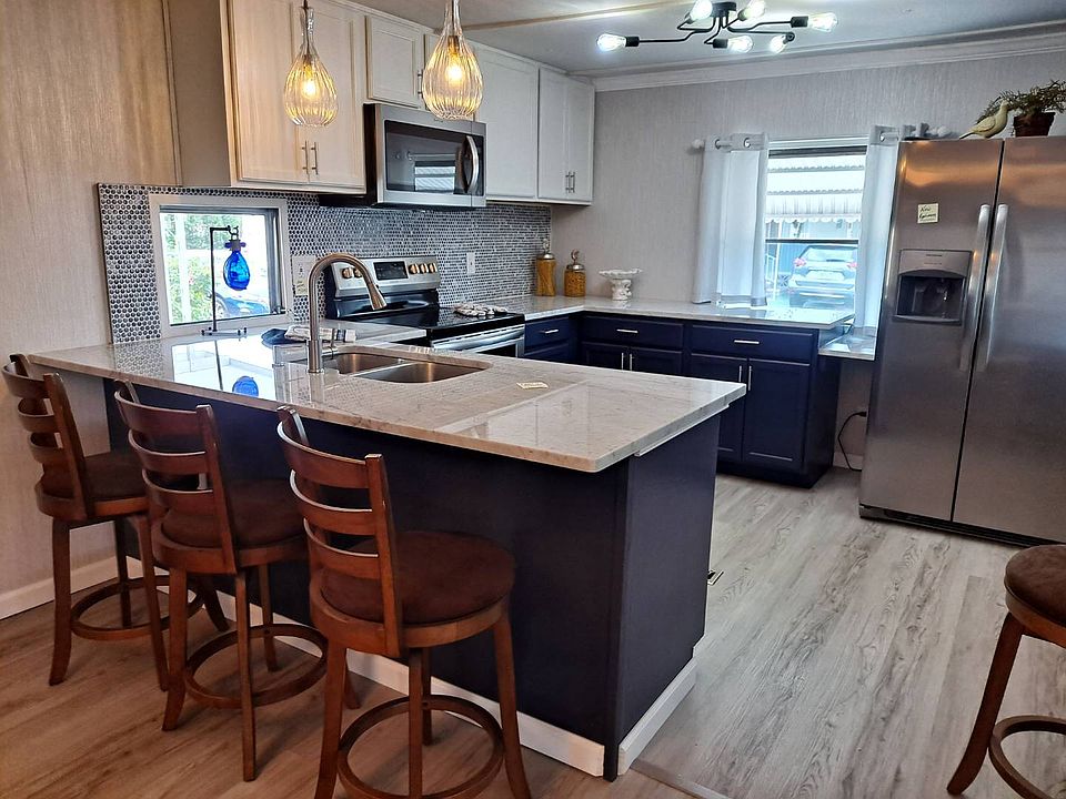 Pescara Lake 55+ community Lot rent $672/mo. (corner lot) includes water, sewer, all year round lawn care, garbage pickup, and all the amenities of the park/ Park accepts 2 pets under 30 lb Fully remodeled two bedrooms two bath single wide with a 12x16 living room addition. This house features a brand new Central AC and heating unit and the duct work has been sanitized. Metal roof has been resealed and painted within the last 30 days and all the appliances throughout the whole entire house are brand new with a warranty. The air conditioner unit has a 10-year warranty all sub-flooring and vinyl wood planking flooring brand new all the wall and window dressings brand new, all new paint level 4 granite tops in the kitchen with a full remodel including cabinets lighting fixtures, etc. All furniture is part of the sale and is brand new and never use. This beautiful nautical-colored theme throughout the house is absolutely stunning clean and conservative. Every inch of this house has been touched on the inside roof is up to date air conditioning unit is new and flooring is completely brand new so there is full peace of mind with this purchase. This house resides on a corner lot just steps away from the clubhouse next to the pool. In addition, this home comes with a three-car driveway with a carport and an 8x12ft shed with washer and dryer hookup ready. All listing information is deemed reliable but not guaranteed and should be independently verified through personal inspection by appropriate professionals. Integrity Mobile Home Sales cannot guarantee or warrant the accuracy of this information, measurements or condition of any property. Measurements are approximate. Lot rent subject to change.