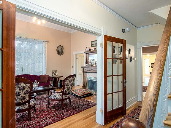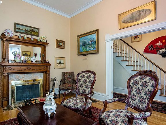 Beautifully maintained Victorian home moved from downtown Eugene to current location in 1991. Crown molding, antique light fixtures, brass hardware, wood floors throughout. Front parlour with high ceiling and fireplace, formal and informal dining rooms, sun room/office with french doors opening to bamboo zen garden. Stunning roses and bulbs in front and back yard. 2 car detached garage, partially converted, with large studio/office above. Antique furnishings negotiable. Low taxes!