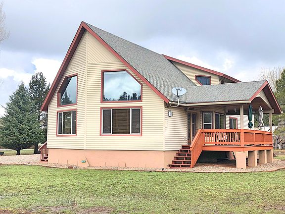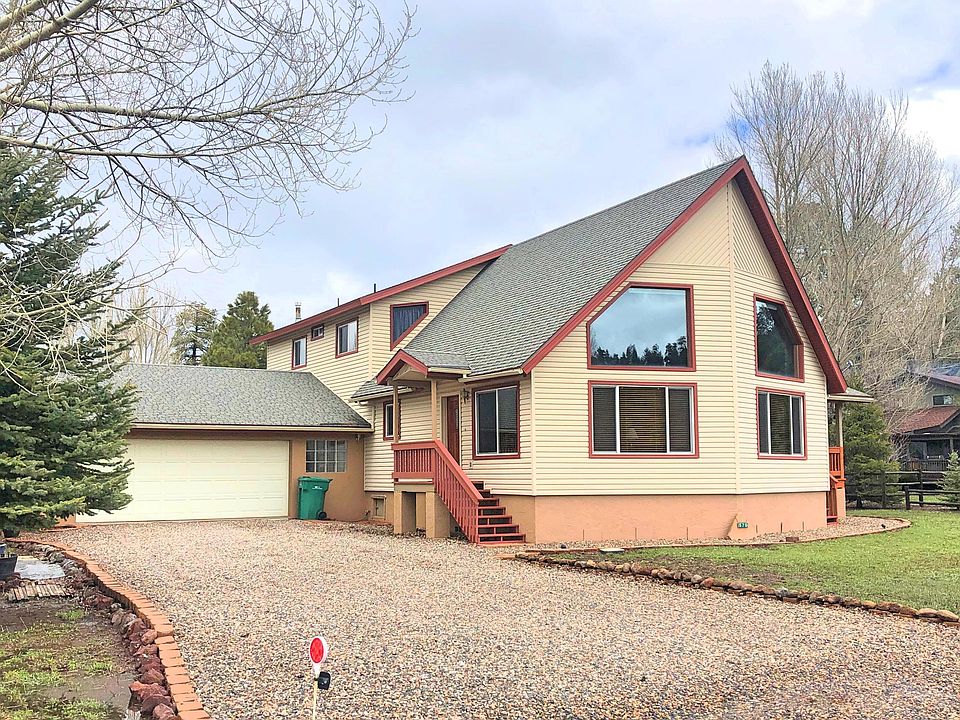 Spectacular chalet with vinyl siding (no maintenance). Oversized garage for two cars and room left over for your golf cart. This home is located on a private road. Three large bedrooms on the main level (one being used as a sewing room). Master suite is located upstairs with glass doors looking out over the large loft and living area. Open floor plan with kitchen, living and dining room all open as a great room effect. Corner propane fireplace in the living area. French doors at the dining room lead to a covered side deck. Large utility room with wash sink and extra storage. This property is located on just over three quarters of an acre, all usable. Trees on lot are on a drip system. Panoramic Views from the front windows to the golf course and mountain south of the golf course