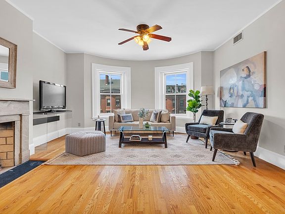 Pristine 3 bedroom/2 bath home offers abundant natural light, great layout and luxurious finishes throughout. Enter to sprawling, sun-filled, bow-front living room with fireplace and plenty of room for a large dining table. French doors lead to one of three bedrooms. Beautiful granite kitchen with cherry cabinets and new stainless steel appliances has convenient breakfast bar and is open to dining area. Spacious primary bedroom has fireplace, en suite tile bath plus door to large private deck with treetop views. Additional bedroom, in-home laundry, gleaming hardwood floors and high ceilings throughout. HVAC system provides gas-forced hot air and central air conditioning. A lovely home close to the finest restaurants and boutiques and everything the South End has to offer!