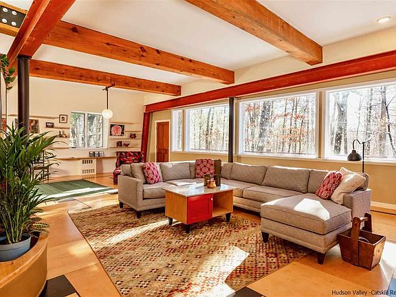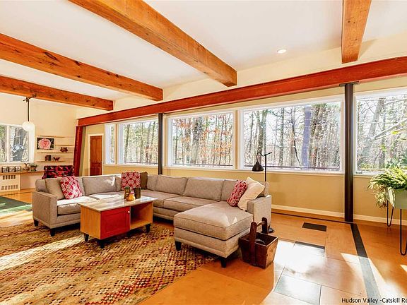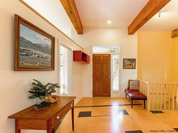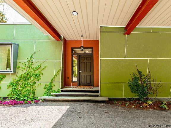 Tucked away in the serene hamlet of Accord, lies a home like no other - a masterpiece of modern design thoughtfully crafted to blend harmoniously w/ its natural surroundings. The home's striking butterfly roof, a architectural gem, immediately captures the imagination, hinting at the innovative wonders that await within. A seamless fusion of heavy steel & rustic wood beams forms the foundation for an interior that boasts a wealth of glass, inviting the surrounding landscape to become an integral part of the living experience. A testament to the owner's commitment to sustainability, this dwelling embraces low-maintenance Hardy cement panel siding & radiant floor heating, ensuring both style & efficiency. But it is the southern exposure of the massive windows that steals the show, allowing for abundant winter sunlight & passive solar gain, creating a warm welcoming atmosphere during the colder months. The living room, with its grand ceiling beams reminiscent of the region's ancient stone houses, coexists harmoniously w/ steel I beams, exemplifying a perfect fusion of local heritage & contemporary design. Delight in the elegance of 10' ceilings on the upper level & 9' downstairs, adding to the sense of space/openness. A custom parquet floor graces the main level, & mahogany doors speak of true luxury & attention to detail. The lower level bathrooms showcase stunning marble tile work, a testament to the commitment to creating one-of-a-kind spaces. On the upper level, angled walls evoke the free form of "glacial erratic" boulders, showcasing the artistic inspiration that guided the design. Before construction even began, thoughtful planning/design set the stage for its innovative green roof & energy-efficient subterranean living spaces. The architects recognized the incredible benefits a green roof would bring, not just in terms of its aesthetic allure but also its practical advantages. By pre-treating the roof for a green oasis, they ensured the home would have a natural insulating layer, significantly reducing the need for excessive heating/cooling. The green roof's vegetation acts as a thermal barrier, regulating indoor temps, keeping the home cool in the summer & warm in the winter. This, coupled with the majority of bedrooms in the lower walk-out basement level, allows the earth's natural thermal mass to play a vital role in maintaining a comfortable living environment year-round. As a result, energy costs are significantly lowered, & the home's ecological footprint is minimized, all while providing an unparalleled living experience that seamlessly merges sustainability w/ sophistication. The soul of the home lies not only in its innovative construction but in its deep rooted connection to nature. The ceiling beams, trim work, & staircase wood all find their origin in the trees harvested on the owner's farm, infusing the home with a genuine sense of place & authenticity. Designed with a modern family in mind, the home effortlessly balances intimacy & spaciousness, making it ideal for gatherings. Its open floor plan, complete w/ defined flex spaces for home office or studio, offers the perfect blend of togetherness & personal retreats. The walkout lower level unveils more wonder, boasting 2 bedrooms, cozy living area, & 2 full baths, plus a convenient laundry room. An oversized walk-in closet room provides versatile space, suitable for another sleeping area, nursery, or home office. A true haven for sustainable living, this exceptional property benefits from the forever-conserved farmland and woods in its western viewshed, courtesy of the Open Space Institute. Lush gardens, adorned w/ climbing hydrangeas & 5-variety wild/cultivated berry garden, enhance the natural appeal and inspire a connection to the land. Nestled within the embrace of nature yet close to local favs like Saunderskill and Kelder's Farms, Inness, Arrowood, Westwind Orchard, & The Accord Market, the home offers the perfect balance of seclusion & accessibility.
