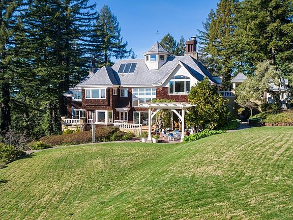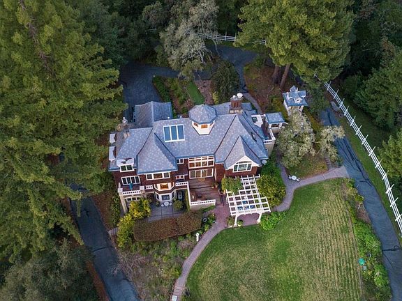 Situated on ~25 acres on a sunny ridgetop with breathtaking Monterey Bay views! The impressive gated estate with shingle style main residence is approached by a long driveway between sunny pasture & expansive lawn. Main house comprises 3 stories plus cupola (lookout tower). Generous farmhouse kitchen with island, breakfast nook, cozy den with gas stove. Formal living room features impressive Rumford fireplace, raised music alcove, pool table area plumbed for wet bar. Family/recreation rm on the lower level with full bath - ideal au pair or in-law quarters. 3 car garage with workshop, possible wine cellar. Uniquely charming outbuildings include the 'Tea House', 2 stall barn with hay loft/workshop, chicken coop/dog kennel, rustic log cabin hideaway/man cave, community library. Usable land for horses or vineyards. Fenced pasture, meadow, hiking/riding/biking trail through private woodland. Solar power, excellent shared well, high speed internet. Happy Valley elementary!