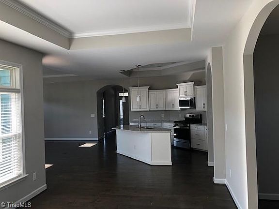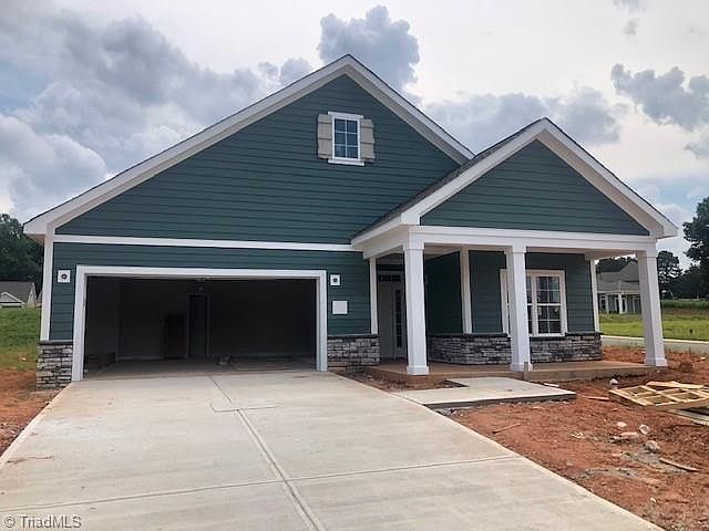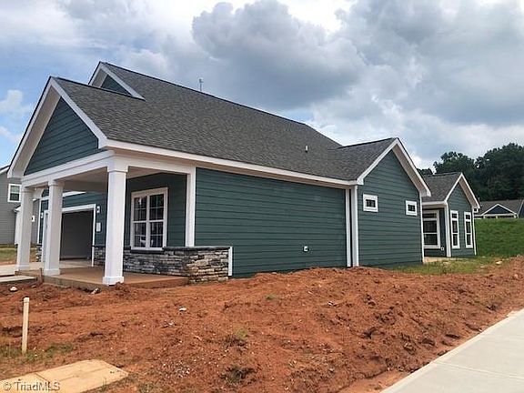 One-level Portico floor plan with exceptional features. Luxurious owner's suite with 13' x 9' Conditioned Sitting Room, huge walk-in closet, and spa-style, tiled, walk-in shower. The Kitchen, Dining, and Living Rooms surround a private courtyard flowing with natural light! Features include arched doorway openings, tray ceilings, a 2' width expansion of the LR/DR areas, natural gas fireplace, and transom windows. Painted cabinets, upgraded quartz w/Ogee edged kitchen countertops, large pantry, brushed nickel fixtures, SS appliances, including gas range. Engineered wood flooring in Kitchen, LR, DR, Den & hallways. Ceramic tile in Laundry Rm & Baths. All lots have irrigation, and the HOA handles lawn care. The community will have sidewalks & a walking trail. Fantastic Kernersville loc., just south of Bus. 40; close to shopping, dining, med. centers. Lots of storage & 2-car garage.