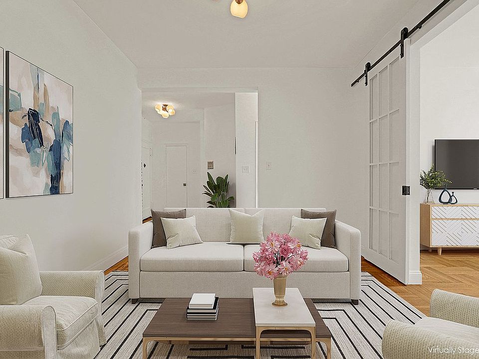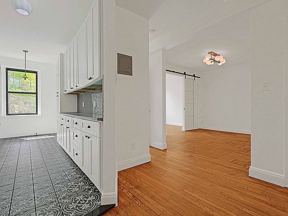 South-facing windows flood the space with natural light, highlighting beautiful refinished wood floors. The gracious entry foyer features three ample closets, while the spacious eat-in kitchen is perfect for cooking enthusiasts, it boasts white cabinets, stainless steel Bosch appliances, custom tile work and a dining area that comfortably seats four or more.