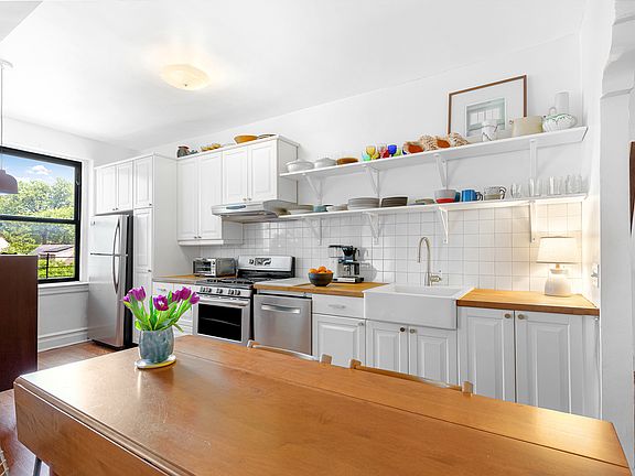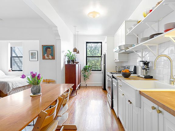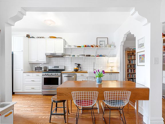 Light, airy renovated 1+ bedroom apartment overlooks the lush huge interior courtyard of this sought after Ditmas Park coop. The apartment marries stunning pre-war architectural details seamlessly with modern living. The unit features unique archways, high ceilings, hardwood & parquet floors, and modern ceiling fans. Its renovated open layout kitchen has both cabinet storage and open shelving, butcher block countertops, stainless steel appliances including dishwasher and 5 burner stove, and designer twin pendant lamps. Flex room off living room can serve as a home office or guest room and features custom storage. Oversized master bedroom has a ceiling fan and two exposures with wonderful garden views. Windowed bathroom has been updated with new vanity, tile, fixtures, and also has large striking Art Deco bathtub with shower. Generously sized entryway allows for additional storage options and is illuminated by a George Nelson saucer bubble pendant lamp. Amenities abound in this PET-FRIENDLY coop: full-time door attendant, Art-Deco lobby, free bike and stroller storage, and cage storage available for a fee, a community children's playroom, plus neighborhood favorite Milk & Honey Cafe is located in the building. Coop is maintained by a live-in super and several porters. Elevator building with extra-wide open staircase. Despite all these amenities, this coop has LOW monthly maintenance fees. Nearby eateries include Ox Cart Tavern, Wattli, Rusty Nail, and Coffee Mob, plus Cortelyou Road's restaurants, bars, year-round Farmers Market, and Flatbush Food Coop. Add in the many pharmacies, banks, and local post office to see why Ditmas Park fees like a small town in the big city. 360 VIRTUAL TOUR AVAILABLE!