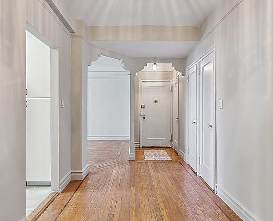 Enter this impeccably maintained fifth floor unit, where a windowed eat-in kitchen with seamless potential to flow into the living area, presents an opportunity to fashion a spacious, airy common area. A generous bedroom awaits down the hall, offering privacy and bathed in natural light from dual exposures. The windowed bathroom retains its original charm while receiving a modern update with freshly reglazed wall tiles and tub. The foyer accommodates enough space for a home office, while five closets throughout the apartment ensure ample storage. Hardwood floors grace the entirety of the residence, adding to its timeless appeal.