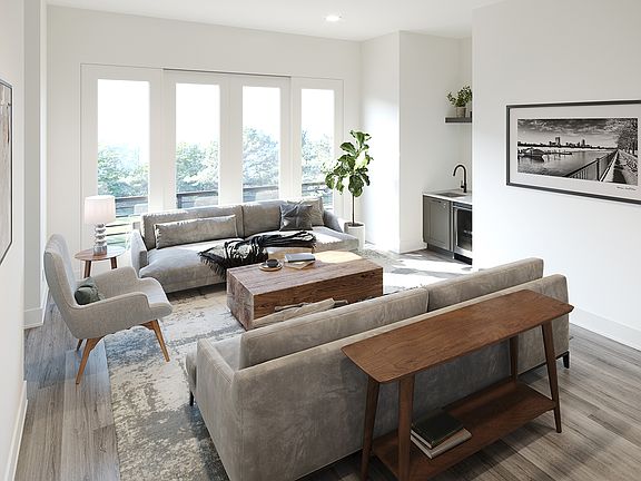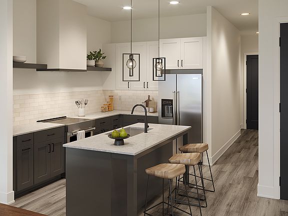 The Morton stacked flat offers 2 bedrooms and 2 bathrooms. This 2-level interior stacked flat is designed with clean lines, natural light-filled rooms, designer interior finishes, 10 ft. ceilings, and wide plank floors throughout. The main level offers the entrance foyer and 2-car tandem garage. Take the stairs to the 2nd floor to find the large living area and spacious eat-in kitchen with a breakfast bar. Beyond the kitchen is the Primary suite with a walk-in closet, and double vanity bathroom, a second bedroom, a full bathroom, and a convenient laundry. Enjoy the outdoors in the community amenities that include a fire pit, and bocce ball court. Walk, bike or scoot to shopping, restaurants, and entertainment and just over a half-mile to England Park Greenways.