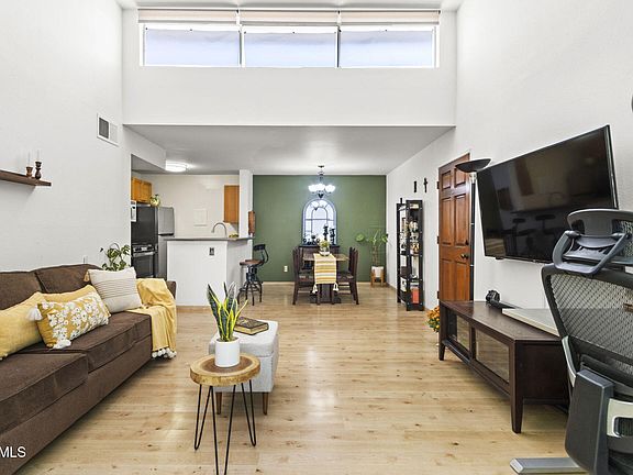 Welcome to this bright, light-filled top floor, 2 bedroom, 1 bath condominium in the sought-after California Village community! This stylish home features a spacious open floor plan featuring a kitchen that opens to a living room with vaulted ceilings and motorized curtains for the upper windows. The primary bedroom offers a walk-in closet and a private balcony provides serene tree-top views.