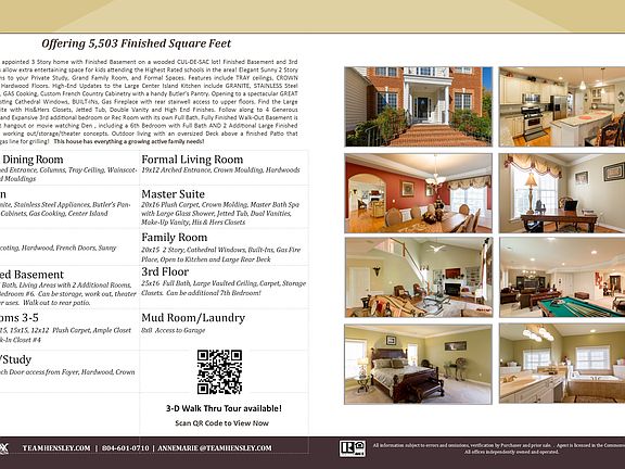 Beautifully appointed 4 Story home with Finished Daylight Basement on a wooded CUL-DE-SAC lot! Elegant Sunny 2 Story Foyer opens to your Private Study, Grand Family Room, and Formal Spaces. Features include TRAY ceilings, Arch Drway CROWN Moulding, Hardwood Floors. High-End Updates to the Large Center Island Kitchen include GRANITE, STAINLESS Steel Appliances, GAS Cooking, Custom French Country Cabinetry with a handy Butler's Pantry including a surround sound/intercom control center. GREAT Room boasts Cathedral Windows, BUILT-INs, Gas Fireplace with rear stairwell. The Large Master Suite has His &Hers Closets, Jetted Tub, Double Vanity. Follow along to 4 Generous Bedrooms and Expansive 3rd Bed/Flex Rm Suite with Full Bath. Fully Finished Walk-Out Basement is the perfect hangout or movie watching Den, including a 6th Bedroom with Full Bath AND 2 Additional Finished Rooms for working out/storage/theater concepts. Outdoor living with an oversized Deck above a finished Patio that includes a gas line for grilling! Lot is clearable into wooded line, look for flag markers. Check attached plat for reference. Everything a family needs for Privacy and Entertaining at a great price!
