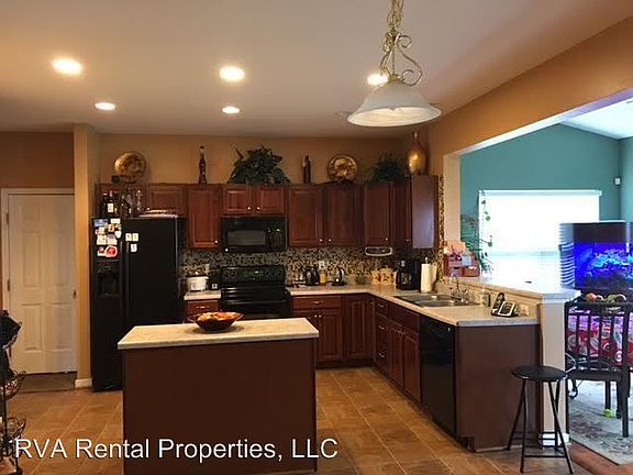 Over 3,000 sq feet of living space in this 5 bedroom multi generational home - Corner lot in the Kings Grove Subdivision in Chesterfield. This rental is great for a multi-generational family, with a living room area, bedroom with WIC, storage and full bath on the third floor, perfect for guests or college student. The rest of the home features a foyer, great room, formal dining room, open living room to the kitchen with an extra dining area which can be set up as an eat in area, office or den. The formal dining room, great room, foyer and eat in area of kitchen is all hard wood flooring. The dining room features a beautiful trey ceiling as does the master bedroom suite. The living room is carpeted, has a ceiling fan with over head lights, recessed lighting, a gas fireplace with a gorgeous mantel and is open to the kitchen and eat in area. The kitchen features an island, cherry cabinets, and a stunning back splash. The kitchen also features a pantry, pull out shelves in the cabinets, a bar area that sits 3 and a door to the attached garage. The eat in area of the kitchen has a partial cathedral ceiling and is very versatile and can be set up as many things, the eat in area of the kitchen, an office, play room, or den and has a door to the back deck of the home. As you walk up to the second floor of the home the first thing you will notice is the over sized foyer that leads you to either the laundry room, linen closet, hall bath or any of the 4 bedrooms. The master suite has a seating area plus room for a king sized bed and multiple dressers with room to spare the master suite also features his and her WICs, a master bath with a Jetted Garden tub plus a separate shower, his and her vanity sink, and a linen closet. The 3 other bedrooms on this floor are all large with either his and her closets or double door closets. The third floor takes you to a separate living area with a full bath tub & shower, a bedroom and a den/office area plus storage space. The home also features a large shed, large energy efficient windows, shelving in the garage and so much more. With 11 rooms in the home you will find more than enough space for living and enjoying. (RLNE2308931)