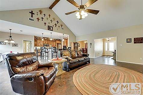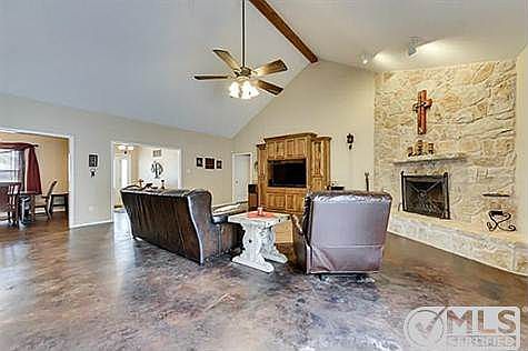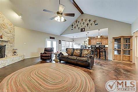 Beautiful custom built home on 8.821 acres. Both pasture and trees. Large pond with a dock including outdoor kitchen. Stained concrete floors, huge kitchen, breakfast bar, stainless steel appliances, custom cabinets, 3 ovens. Master bath has tile double shower. The master closet is 12x10. Utility has walk in pantry, sink, and a second utility with mop sink. Property has 2 wells. The storage building is 30x20 with loft, insulated, power
