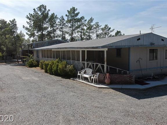 Single wide Manufactured home on an acre with additions for a total of approximately 1400 Sq Ft of living space. Home is in need of TLC but is liveable in present condition. Additions create an open feeling, just needs updating. Is converted to real property, but due to the fact that it is a single wide and that it has multiple additions, it cannot be financed. RV Garage attached to home, RV hook-up in back yard, Pine trees, multiple outbuildings and shade coverings. Window AC unit in front area of home and Centeral Propane heater that hasn't been used for years and no Propane presently on the property. Access to street behind home with drive-thru gate. Property is completely fenced. Well Established property with pine trees for someone has the skills to fix and repair. Owner will Carry with 50% Down. Bring your vision and make an offer on 5700 S Pahrump Valley Blvd!