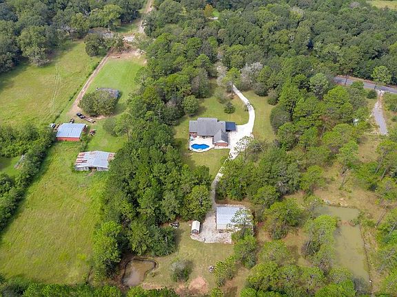 Secluded country charmer situated on almost 5 acres with a 30 x 50 workshop. This 4 bedroom 2.5 bath home has been immaculately maintained and still looks new. This beautiful home features split floor plan with huge great room. Spacious kitchen with abundance of custom stained cabinets, island and eat-in bar, stainless 5 burner gas stove and pantry. Large formal dining room and breakfast area. Master suite features soaking tub and separate shower, large walk in closet and his/her vanities. Oversized utility room with storage. Amazing backyard perfect for entertaining with large covered patio & 2 year old in-ground saltwater vinyl pool w/concrete edging & waterfall. Fenced pool area, 30 x 50 metal workshop is on a slab w/electric, water & has 2- 10 ft. roll up doors. Small pond and small workshop also included. Qualifies for 100% rural financing. Not located in a flood zone. Previous seller reserved minerals. This seller reserves hot tub and gym equipment in shop,