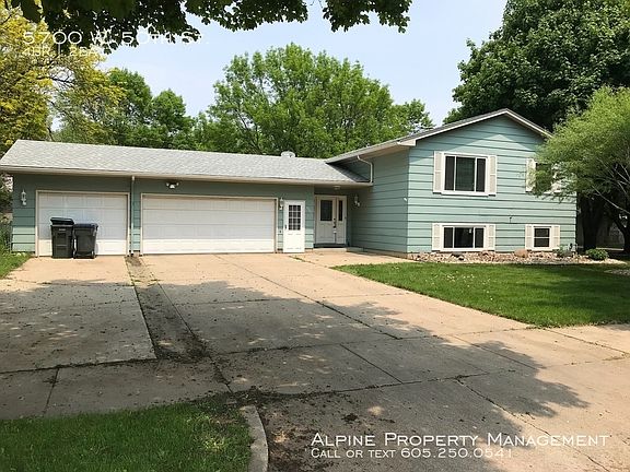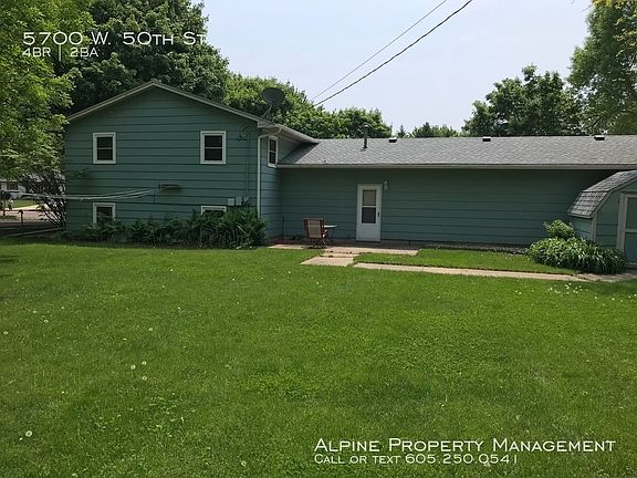 SCHEDULE A SHOWING ONLINE AT: showmojo.com/lh/5b7f485066 MOVE IN SPECIAL - HALF OFF FIRST MONTH'S RENT!! Schedule a tour of this incredible 4 Bedroom/2 Bath 2,061 sq ft single family home on the west side of Sioux Falls at 5700 W. 50th St. today!! This split-level home was recently updated with new flooring and paint throughout. The upper level features a large open concept family room, dining room, and kitchen with dishwasher, stove, microwave, and fridge with hardwood flooring throughout. The two upstairs bedrooms are carpeted and one features a wall-mount tv. The upstairs bathroom has a tub shower, large sink/vanity and linen closet. Downstairs you will find another large family room, laundry room with washer/dryer included, two more sizable bedrooms, and second bathroom with a stall shower and linen closet. There is also lots of extra storage/linens closets throughout. The backyard is very large and fully fenced in and also includes a utility shed and patio. The attached garage fits 3 vehicles and plenty of parking space out front as it is a corner lot unit!! Professionally leased and managed by Alpine Property Management Attached Three Car Garage Central Air Corner Lot Fully Fenced In Yard Hardwood Floors In The Kitchen/Dining Laundry Room With Washer/Dryer Move In Special Half Off First Month's Rent Non Smoking Online Tenant Portal Pet Friendly Second Family Room Stove Tub Shower Utility Shed