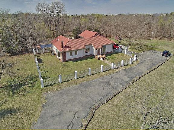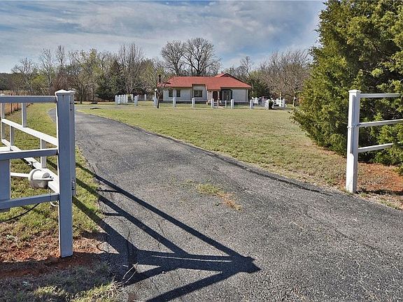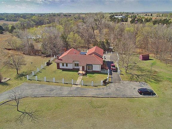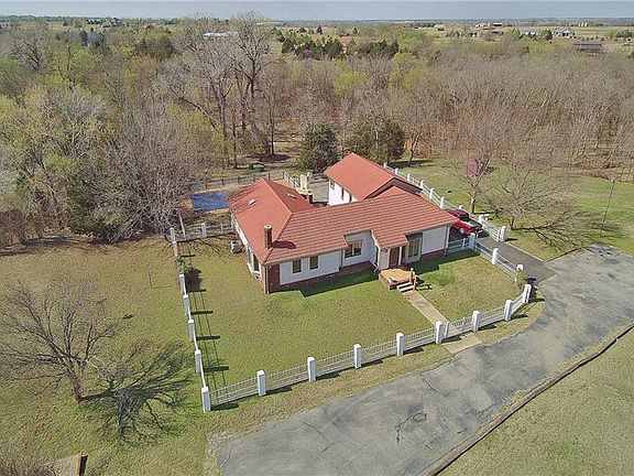Fabulous Palm Spring style, 4 bedroom home with large in-ground pool on two acres! You will be awestruck by the gorgeous wood floors when you walk in the house. The family room is open and inviting with its cathedral ceiling and wood beams. Eating area and kitchen open to family room making it a wonderful spot for not only family living but also entertaining! Master suite is on the first floor and is enormous. Not only is the bedroom large but attached to it is large room that could be used as a sitting area, study, or nursery. The fireplace shared by both the bedroom and living space make for a cozy retreat. There is also a sun room on the first floor that can entered from the porch or master bedroom. Upstairs are 3 bedrooms, one with a built in desk, and a large bathroom. There is a half bath in the 2 car attached garage. The backyard has an outdoor fireplace, large in-ground pool, and an endless view of the Oklahoma landscape! Unbelievable to get all this at this price!