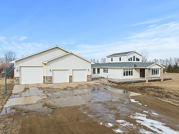 Check out this beautiful rural property located 5 minutes west of Minot on a gorgeous 10-acre lot surrounded by mature trees. Once you enter the house you will see a large open foyer with lots of windows and access to the downstairs. The open kitchen has a new large island, new refrigerator, gas Range/Oven and lots of cabinets and counterspace perfect for entertaining family and friends. This amazing home has so much natural sunlight coming in the kitchen, dining room and living room windows including the loft area with a cozy gas fireplace creating a warm and relaxing atmosphere perfect for an office, craft room or reading/homework area. There is another access to the basement near the living room area. Two bedrooms on the main floor including a large Master bedroom, walk-in closet and a full bathroom. Main floor laundry room plus an additional laundry room downstairs. Two large spacious bedrooms downstairs with vanities, sinks and running water. The basement also has a large family room with egress windows, a large storage room and bathroom. The oversized 40 x 44 heated garage is every man's dream with two separate areas, one for a workshop, boat, RV with a large overhead door and one side for your vehicles of almost any size. The backyard has a large, fenced yard and a 10 x 21 concrete patio. There was a new roof in 2020. There are endless possibilities with these 10 acres. You could build a shop and/or have horses or livestock and there is a large chicken coop already to go. This amazing property presents an ideal opportunity to enjoy the tranquility of rural living without sacrificing modern comforts.