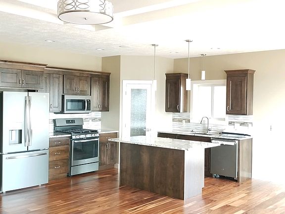 Beautifully constructed and newly built, this 4 bed 3 bath ranch home with an oversized 4 stall garage is sure to impress. You will be stunned from the moment you enter the front door with the bright, open floor plan, the gorgeous cabinets and the fresh looking millwork. Cozy living room with nice fireplace. You will enjoy the main floor laundry, Large master suite with walk in closet, & nice master bath with tiled shower. Lower level is finished with 2 bedrooms and a bath. Surround sound wired throughout the Living Room, kitchen, master bath and bedroom, garage and deck. Family room is finished with a fireplace and large bar area for entertaining. Covered back deck with complete landscaping, sod and sprinkler. Garage is completely finished with heater, floor drains and water hook ups.