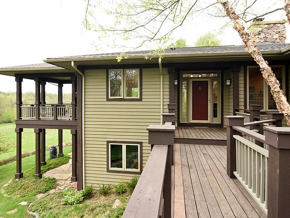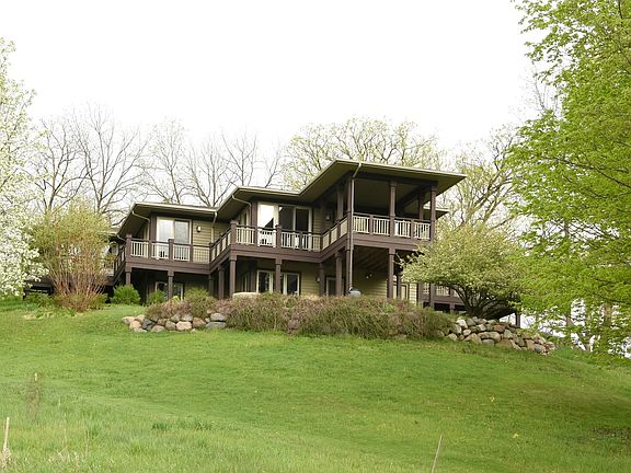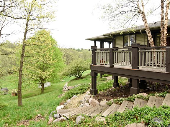 This custom Prairie-style home is perched atop a vista overlooking a spring fed pond and 20 acres of newly deeded open space. Fabulous open floor plan with dining room and gracious great room opening to wrap around deck for 180 degree views. Great room has wood burning fireplace and is large enough for two separate sitting areas, surrounded by windows and doors to deck. Open kitchen leads to porch off the deck. Main floor master suite has spacious dressing room and walk in closet, five piece bath and opens to the wrap around deck. There is a second bedroom, presently used as home office, laundry and two car garage also on main floor. Walk out lower level has a third bedroom, full bath, huge family room, workshop and unfinished space, perfect for gym, media room or storage. This refreshingly bright and sunny home was designed to emulate the architecture and prairie design of Frank Lloyd Wright and offers flexibility in floor plan and use of space.