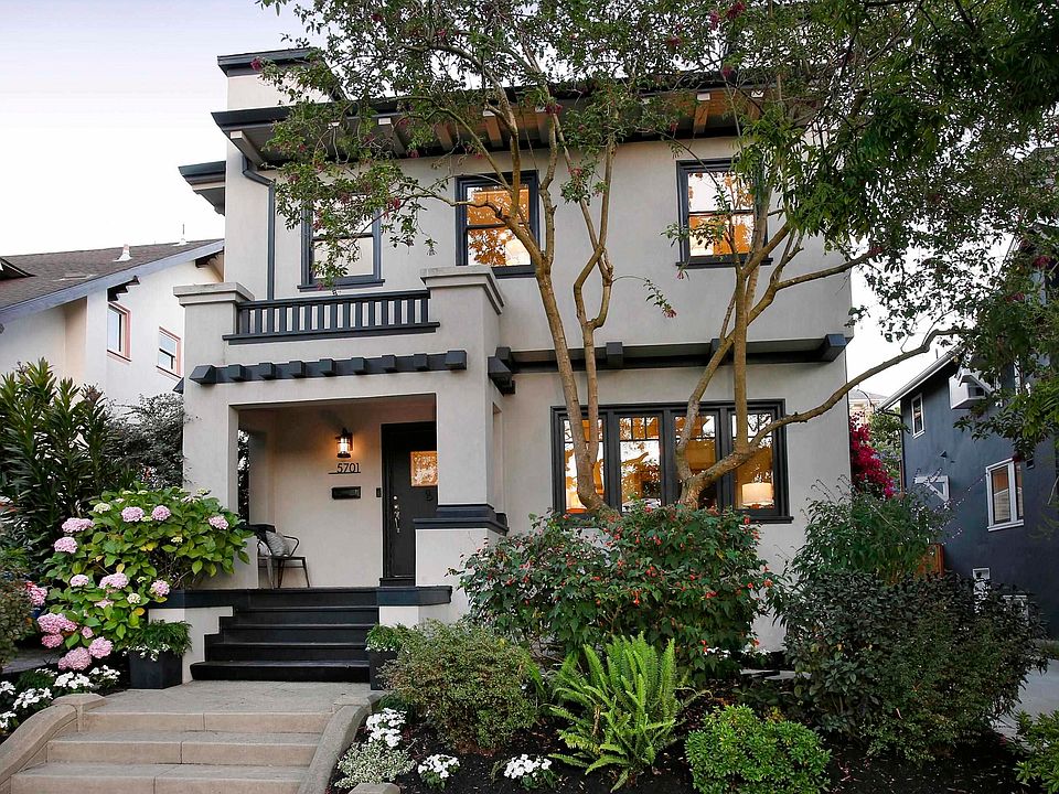 This chic, two-story Craftsman home in the heart of Rockridge offers a charming blend of period details and modern updates. The front entry and living room welcome you with their natural wood trim, refinished hardwood floors and inviting fireplace. Featuring beautiful built-ins and box-beam ceilings, the adjacent dining room flows into the updated eat-in kitchen with adjacent family room. French doors from kitchen open onto the spacious back deck and sunny garden, creating the perfect indoor-outdoor connection and entertainment space! A convenient half bath completes the main level. Upstairs, the spacious primary suite features a stylish ensuite bath. Three additional bedrooms, including one with balcony overlooking the rear garden. Outside, the cheerful, private back patio and gardens offer a peaceful retreat with flowering plants and café lights while the two-car garage and driveway with gate ensures parking convenience and security. Located just a block from Market Hall and the best Rockridge shops, restaurants, and BART, this home offers serene residential living in central Rockridge.