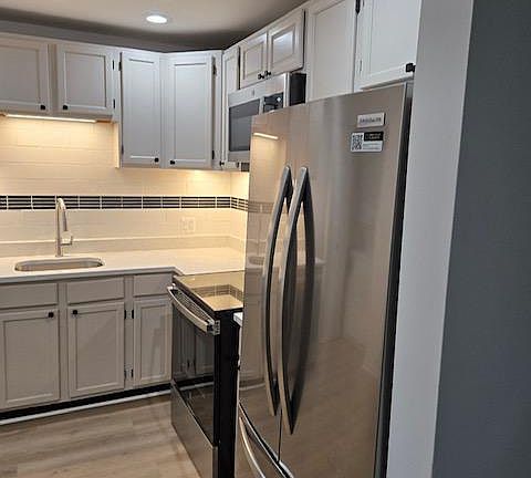 Beautiful and complete remodeled 2024. 2 Bed and 1 Full Bath. First floor Unit - Stainless steel appliances, walking closets, washer and dryer in the unit. Quartz counter tops in kitchen. Water resistant flooring. New carpet in bedrooms, freshly painted. 2 reserved parking spaces, small storage, under cabinets lighting, patio area, Community Pool, small building, only 9 condos. Close to major highway 270, shopping and bus stops.