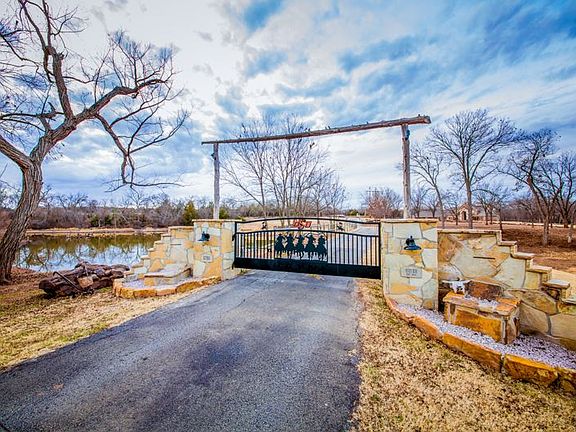 Timeless Treasure in Hunters Ridge! This extremely impressive custom built home was constructed in August 2011 & located in the very back of the subdivision on a paved road. The home features 4 bedrooms, 3.5 bath & has approximately 5200 sq ft and sits on 13 acres. Entryway to the property has a custom Oklahoma State steel gate with spectacular rock columns. Driveway is lit with decorative lights, which can be controlled by timer and has many other virtues that leads to this must have home! There are also 2 additional private gates. The majestic 17x6 entry way with a double steel door makes a grand statement yet is very inviting. The home is equipped with custom wood stamped, stained, and heated concrete floors downstairs. All woodwork has been hand glazed and distressed giving the home a unique rustic look. Master bedroom has a custom king size garage door bed made from an old 1960 garage door/salvaged wood columns from a property in Hurricane Katrina that will remain. His/her large master closet with built-in dressers. Relax in this one of a king master suite bath with custom rock complete with a soaker tub accompanied by a small fireplace and grand walk in shower. The kitchen was made for entertaining family and friends. It features granite countertops, built in seating for 10+, double ovens, wine cabinet with cooling station & a plethora of cabinets for storage. A must have walk in pantry with many details to enjoy. Media room with many extras can double as a game room equipped with built-in audio/speakers. Upstairs has 2 bedrooms, living room/bonus room w/2 3 more additional finished rooms upstairs. Unique features in the office include wood,tin from a barn near Duncan, OK. Oversized 4 car garage and farthest bay having custom cabinets & sink for the man/woman cave! The backyard is a world of its own featuring an outdoor kitchen, surround sound, swimming pool (lifetime warranty; special feature 400BTU heater, which can heat pool from 50 to 100 degrees in less than an hour), water feature and gas fireplace. The back porch is enclosed by a rod iron gate that allows you to keep animals or children in & out of the pool area for safety. This view is absolutely beautiful and serene in the fall with all the wild life. There is a pavilion with running water and electricity, which makes for wonderful family time and special events. There is even a location to have a garden with access to water. Call for your private viewing! Owners/Licensees