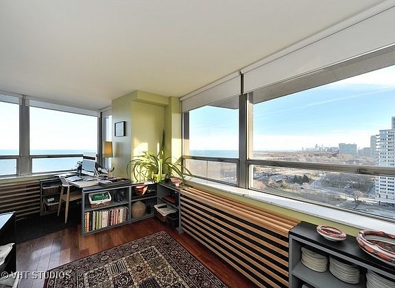 MAGNIFICENT LAKE, BEACH & SKYLINE VIEWS from this EXTREMELY RARE 18th Floor CORNER UNIT in Hollywood Towers at Edgewater Beach. A SUNNY, SPACIOUS, warm & inviting layout with a beautiful OPEN KITCHEN, Santos MAHOGANY FLOORING, custom built-ins & window treatments, UPDATED BATH with heated floor & WHIRLPOOL TUB & tons of closets in a fantastic, full amenity building ON THE BEACH/bike path with an affordable rent that INCLUDES HEAT, A/C, CABLE TV, INTERNET & more! Indoor, heated valet parking is $160 with a short wait list. Express bus at door. 2 blocks to Red Line. Beach at back door. Walk to shopping, restaurants, theater, Loyola U, everything!!