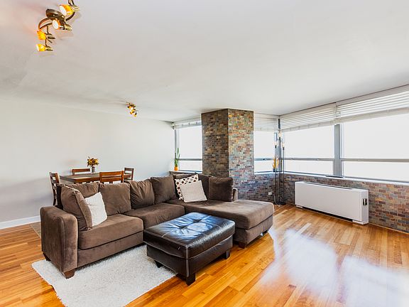 You must see this beautifully detailed, large, penthouse unit with amazing view up the lake shore. Truly a unique custom unit with a large and gracious rooms, tons of closets and custom paint. The unit is extra bright & sunny with wonderful views of lake. It boasts custom designed brick accent walls, hardwood floors, a new Kitchen with 42" Cherry cabinets, granite counters, custom backsplash, under mounted sink and stainless appliances. Bathroom has been completely redone with designer tile, lighting, vanity and mirror. Bedroom is extra large and contains an entire wall of closets. Amazingly beautiful mid-century lobby. The building includes extra storage, bike room, pool, 24 hr doormen, commissary, and on sight management and maintenance. This is a must see!