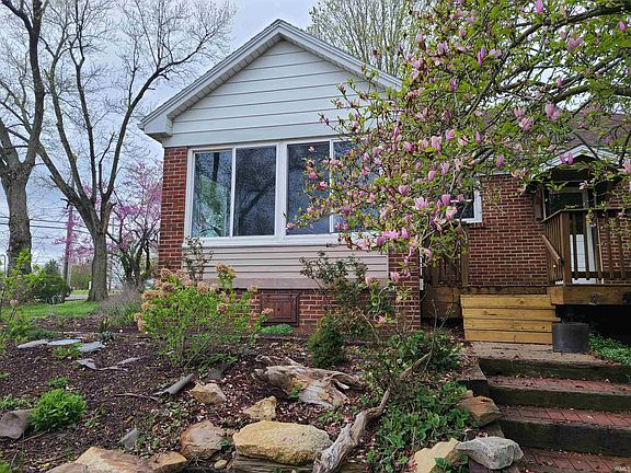 Great, well maintained bungalow on Evansville's Westside situated on 1.8 acres with a combination of open space and plenty of trees. Lots of original woodwork, an open living/dining room combo with beautiful hardwood flooring leading to the cheerful kitchen. Dishwasher new in 2024, gas range/oven new in 2021 and overhead vent new in 2021 per owner. Lots of freshly painted rooms including the bathroom, which also has a new tub and toilet. Home owner has preserved the original glass doorknobs throughout to offset the beautiful woodwork. There is a large family room in the basement with additional rooms for tons of storage space and a storm shelter room for your safety. There is a propane wall heater in the basement for alternate heating if necessary. A built in safe is in the wall (key included) for your "treasures". A workshop area with a new toilet and roughed in plumbing for a shower is also in the basement. Water heater new in 2020 and a humidifier with "air scrubber cleaner" added to the HVAC in 2022, and extensive, updated plumbing per owner. New 2 car detached garage. Sellers are only the 2nd family to occupy this solid, charming home with many fruit trees added to include peach trees, figs, grapes and pecan trees. The septic was pumped in 2024 and is in great condition, per owners. The entire property has an underground dog fence. New city water lines were completed in 2023 for most of New Harmony Rd.